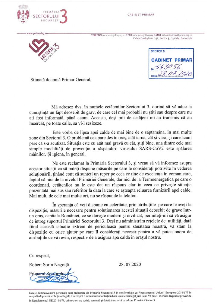 „Ne este reclamat la Primăria Sectorului 3, și vreau să vă informez asupra acestor situații ca să puteți dispune măsurile pe care le considerați potrivite în vederea soluționării, ținând cont că sunteți un reper pe ceea ce ține de excelența în comunicare, faptul că nici de la nivelul Primăriei Generale, dar nici de la Termoenergetica pe care o coordonați, cetățenilor nu le este dat un răspuns clar în ceea ce privește situația prezentată mai sus referitor la data la care se așteaptă reluarea furnizării apei calde. Mai mult, de cele mai multe ori, nu se răspunde la telefon.