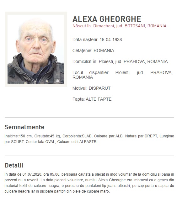 Alexa Gheorghe, născut pe 16 aprilie 1938, a dispărut din Ploiești, județul Prahova. Semnalmente: înălțime – 150 cm, greutate – 45 kilograme, corpolență – slab, culoare păr – alb, contur față – oval, culoare ochi – albaștri.