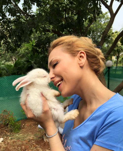 În fotografiile publicate pe Facebook, vedeta TV apare săruntând un iepuraș alb. Mesajele care însoțesc pozele sunt „warm kiss” si „happy”.
