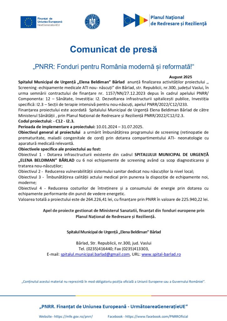PNRR: Fonduri pentru România modernă și reformată!, Spitalul Municipal de Urgență „Elena Beldiman” Bârlad