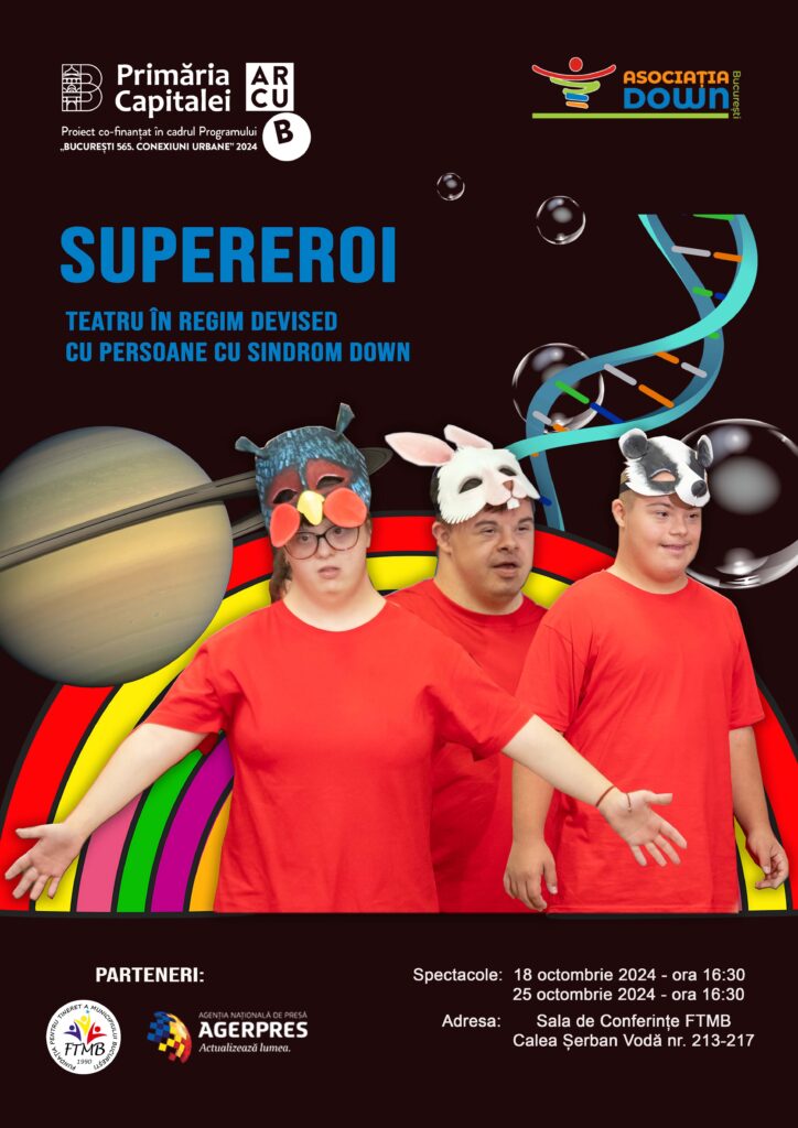 Începând cu 15 august 2024, Asociația Down București, în colaborare cu FTMB – Fundația pentru Tineret a Municipiului București, inițiază repetițiile pentru piesa “Supereroi” – cea mai recentă producție de teatru muzical din România în regim devised cu persoane cu sindromul Down.
