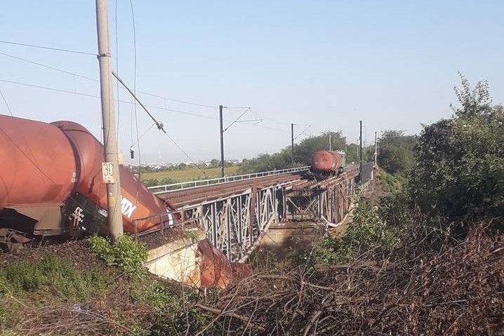 Potrivit acestuia, podul s-a rupt pe o distanţă de 50 de metri, cinci vagoane au căzut în râpă, iar trei sunt în pericol de prăbuşire, dar nu există pericol de explozie.