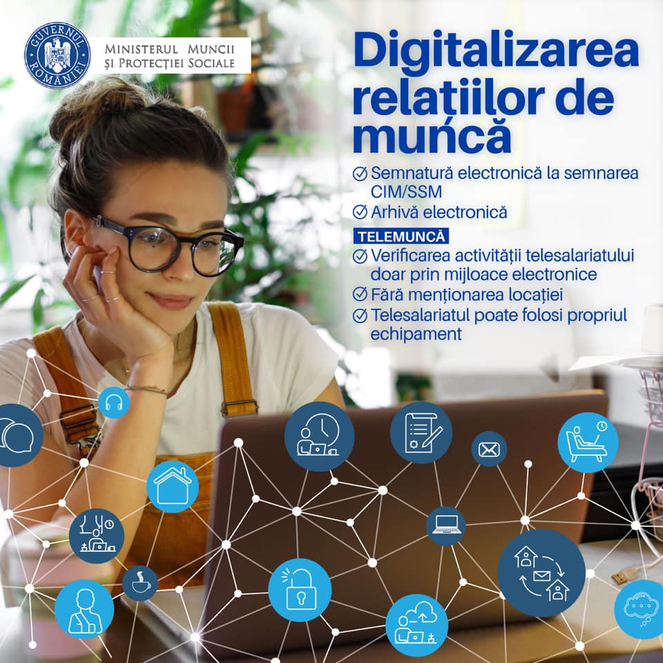 Ministerul Muncii Violeta Alexandru a anunțat că a finalizat actul normativ privind digitalizarea relaţiilor de muncă, care introduce semnătura electronică pentru semnarea contractelor şi simplifică activitatea prin telemuncă, a anunţat, pe pagina de socializare, ministrul de resort.